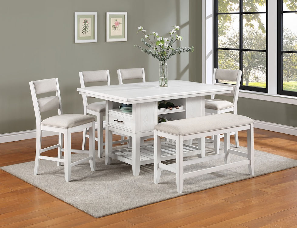Bring a fresh look to your dining space with this breezy counter height group. The table has an array of design features, including drawers, bottle storage, and an open bottom shelf. Ladderback chairs and bench are upholstered in a Chevron pattern fabric with piping detail.
